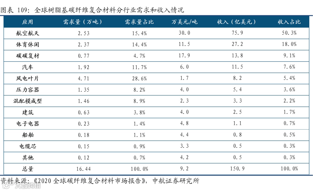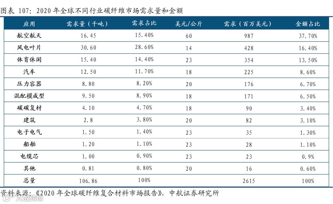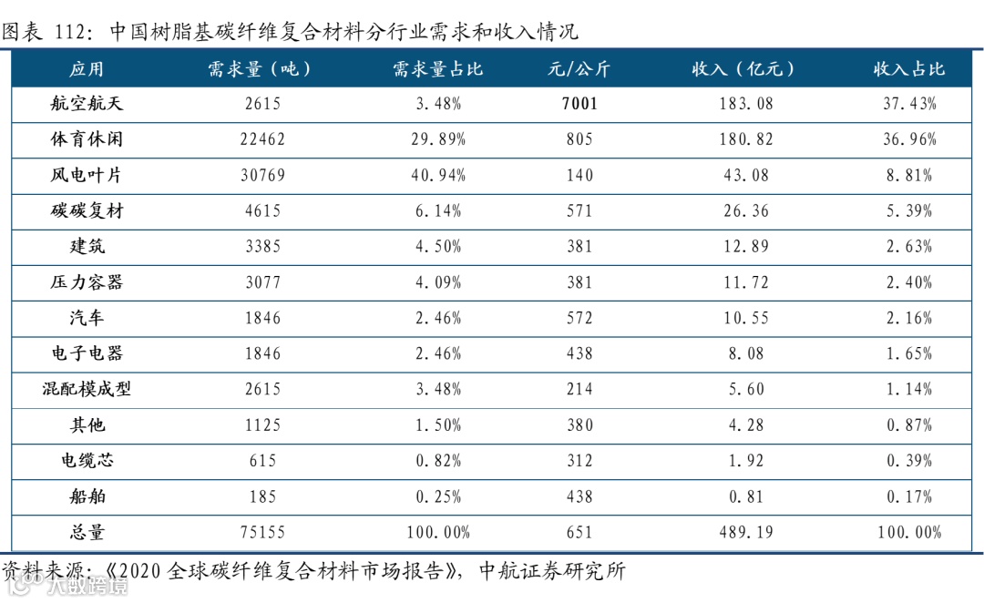 从应用行业来看,风电、航空航天、体育休闲、汽车是使用碳纤维最多的四个领域。其中,由于航空航天所用的碳纤维单价显著高于其他行业,它以15%的市场份额占到38%的市场金额,体现了较高的附加值。