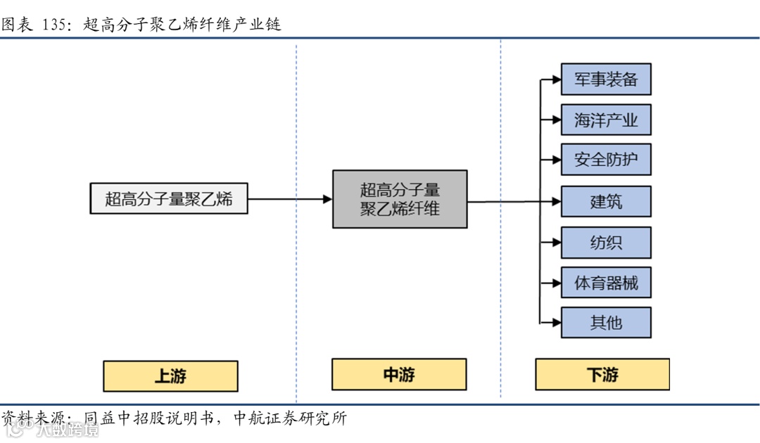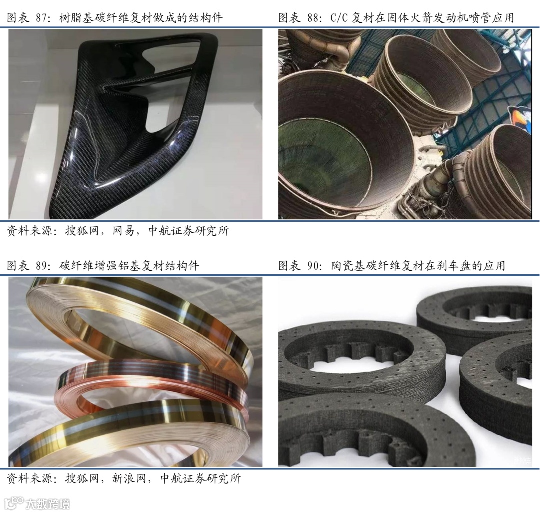 碳纤维及其复合材料凭借其低密度、高强度、高模量、高稳定性的特点,在航空航天、汽车船舶等领域应用广泛,引领着轻质化材料的浪潮。碳纤维产业的发展受到国家政策的大力扶持,碳纤维在中国制造2025中被列为关键战略材料之一。碳纤维复合材料能够应用于飞机机身、喷气发动机、涡轮等部件,还可应用于火箭、导弹以及人造卫星中,此外在船舶上也有应用。目前我国已经从上游碳纤维本身打破了国外的封锁,尽管在成本控制上仍然存在差距,但随着高性能碳纤维在武器装备上规模化应用,有望进一步拉动整个产业的良性发展。