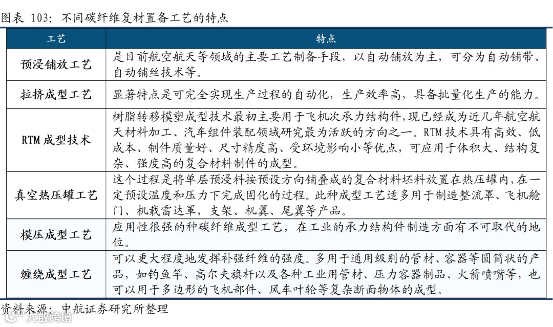 航空航天碳纤维及其复材价值更高。碳纤维复合材料的主要收入来自航空航天,其中,波音、空客与美国的军用航空航天占据绝大部分市场。航空航天军工的复材工艺环节比较复杂,从预浸料、自动铺带铺丝、热压罐、装配,每个环节的各类检验手段。这些均在碳纤维基础上,增加了很多附加值。而其他工业用碳纤维复材,尤其是近两年风电领域,通过拉挤成型直接制造风电碳板,大幅降低了成型复材成本。此外航空航天的研发周期更长,一款新的复材进入机型,周期起码十年,而风电碳梁通常在1-2年,一定程度也加大了航空航天的附加值空间。