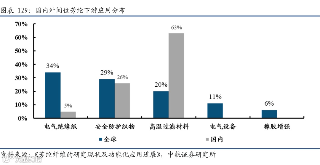 间位芳纶方面,国内有60%左右用于相对低端的工业过滤领域,仅有10%左右用于高端的绝缘与蜂窝芯材领域,而国外40%左右用于绝缘与蜂窝芯材领域,仅有20%左右用于工业过滤领域。因此,我国芳纶产业急需高端发展,并且仍有十分广阔的进口替代空间。