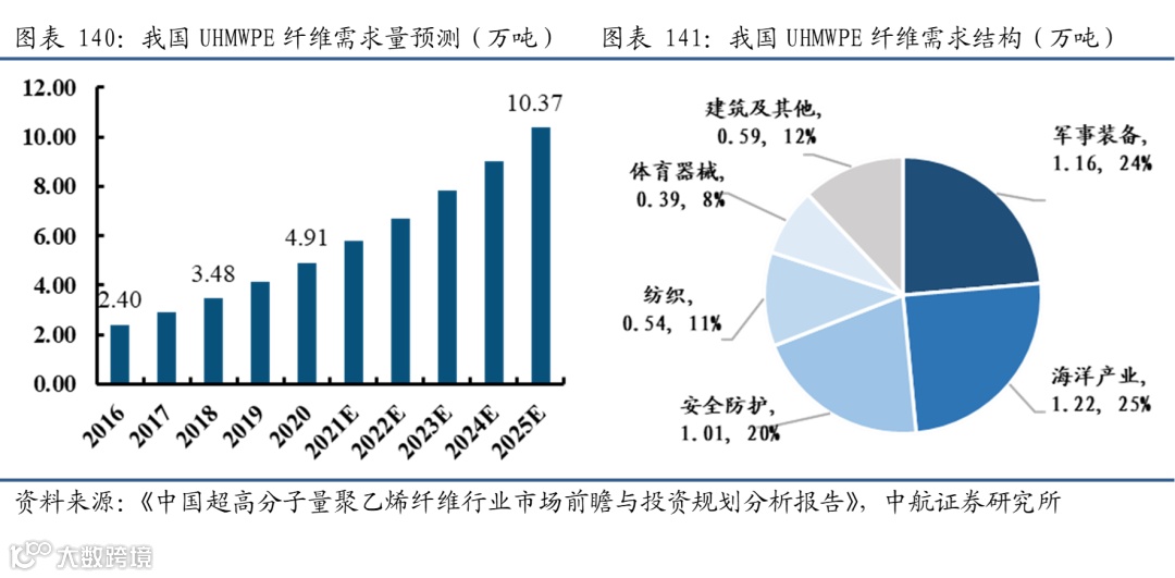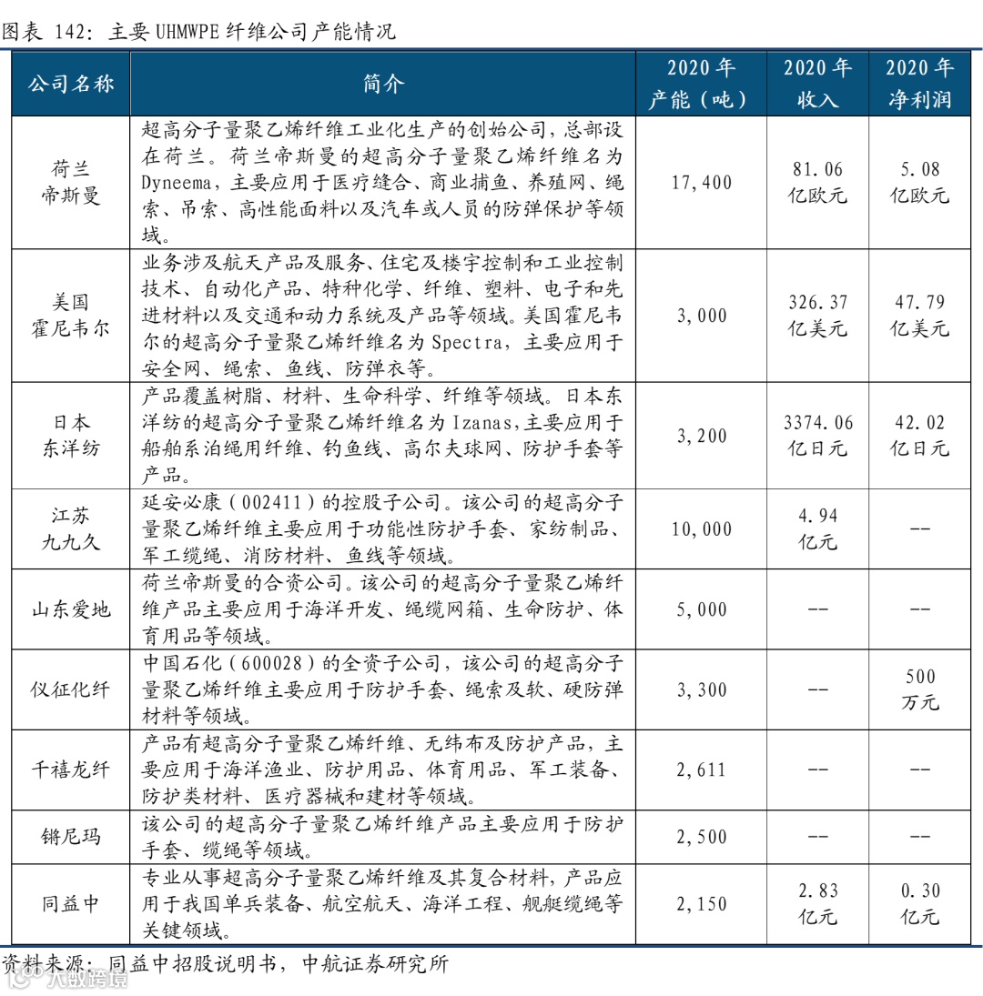 目前三大高性能纤维分别为碳纤维、芳纶纤维、以及超高分子量聚乙烯纤维。工业和信息化部2019年发布的《重点新材料首批次应用示范指导目录》中,将符合相关性能要求的超高分子量聚乙烯纤维、高性能碳纤维、芳纶及制品等高性能纤维及复合材料,都列为“关键战略材料”。三种纤维及其复材凭借各自优异的性能,目前在国防军工领域的应用深度、广度不断提升。而除了这三种纤维外,包括石英纤维、陶瓷纤维相关的复合材料也有相应的军工应用场景。从三大高性能纤维的地位来看,碳纤维、超高分子量聚乙烯纤维的问世,一定程度压缩了芳纶纤维的应用,但由于纤维性质的差异,三者也均在不同的应用场景有着无可替代的位置,有时甚至还会一起使用,比如对于碳纤维复合材料,可以通过添加几层芳纶纤维织物来提高抗冲击性能。由50%的碳纤维和50%的芳纶纤维组合而成的混杂复合材料,与仅由碳纤维制成的复合材料相比,抗冲击性能最高可提高25%。同时,相对于一些传统金属材料,这些高性能纤维材料更“年轻”,未来性能指标有望持续提升。