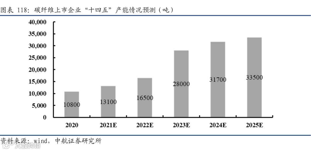 受益热场部件、刹车盘市场,碳/碳复材发展迅速。碳/碳复材是在碳纤维基础上进行了石墨化增强处理的产品,碳/碳复材能够耐受2000℃的高温,是极少数在高温下力学性能不降反升的材料。主要有三大应用,分别是热场部件、航天部件、刹车盘等领域。2020年全球碳/碳复材的需求规模大约为5000吨,国内约3000吨。目前受益于“双碳”政策刺激,光伏热场需求激增,同时在国内军机数量快速增长以及实战化训练的环境下,飞机刹车盘需求也同步提升。假设这部分碳纤维需求年复合增速为30%,预计到2025年碳/碳复材碳纤维需求有望达到1.86万吨。