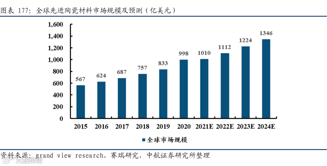 全球先进陶瓷市场规模稳步增长。伴随先进陶瓷各种功能的不断发掘,其在微电子工业、通讯产业、自动化控制和未来智能化技术等方面作为支撑材料的地位日益显著,市场容量也进一步提升。2020年,全球先进陶瓷市场规模约998亿美元,年均增长约10%,预计2024年可达1346亿美元。
