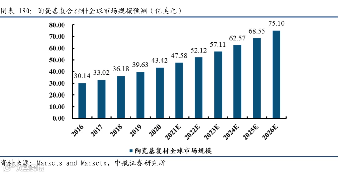 根据Markets and Markets发布的报告预测,预计陶瓷基复合材料的全球市场规模在2026年将达到75.1亿美元。年复合增长率以9.65%的速度迅速增长,市场对高强、轻质、节能材料需求的逐步增长,以及国际航空航天和国防工业的繁荣均成为全球陶瓷基复合材料市场增长的主要推动力。