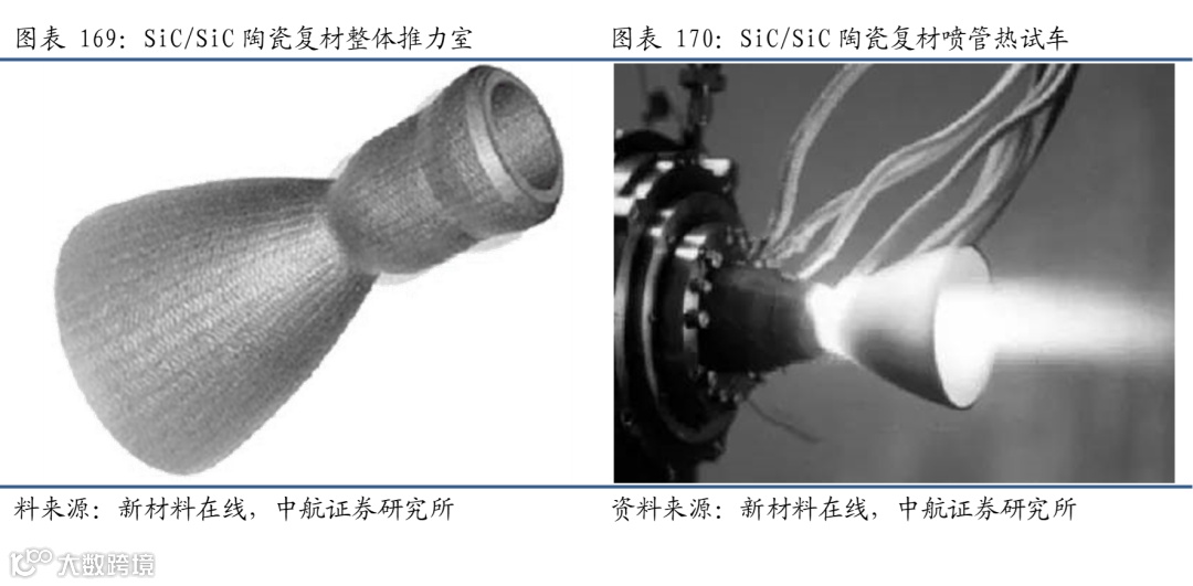 用于火箭发动机热结构件:陶瓷基复合材料可用于火箭发动机中。由于陶瓷基复合材料耐热冲击性高,对液体推进剂化学稳定性高,比金属材料耐高温,具有较高的抗蠕变性,是一种理想的液体火箭发动机热结构件材料。