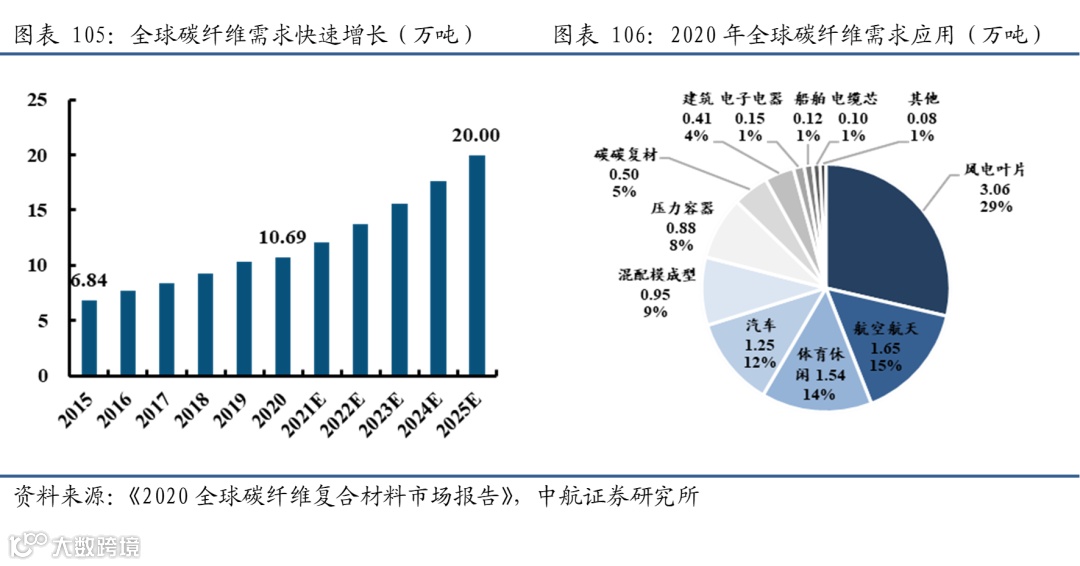 全球碳纤维及复合材料快速发展:2020年全球碳纤维市场需求约10.69万吨,较上年提升3.05%。其中,风电占比29%,航空航天占比约15%,体育休闲占比约14%,汽车占比约12%。预计到2025年,全球碳纤维市场需求量有望达到20万吨,年复合增速在13%。