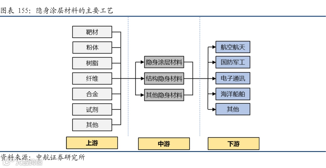 隐身材料是具有隐身功能材料的一种统称,产业链上游主要是相关原材料,如靶材、粉体、树脂、纤维、合金及试剂等,中游为隐身材料的制备商,下游为具体的应用领域,主要还是国防军工的武器装备方面。
