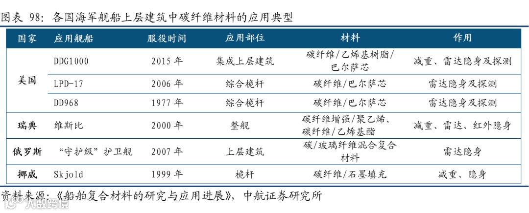目前碳纤维复合材料在船体的应用尚在尝试阶段,但在舰船关键部件已经得到应用。碳纤维复合材料可应用于船舶上层建筑,可减轻上层建筑的质量,提高安全性能;用于舰船推进器,可减轻推进器质量,降低油耗、延长使用寿命;用于桅杆、船体结构,可增加整体强度;CFRP叶片不仅更轻、更薄,还可改善空泡性能、降低振动、减少燃油消耗;在推进系统上可用作螺旋桨和推进轴系,减轻船体的振动效应和噪声,多用于侦察舰和快速巡航舰;在机械和装备上可用作方向舵,某些特殊的机械装置和管道系统等。此外,高强度的碳纤维绳索在海军军舰的缆绳和其他军用物品上也有较为广泛的应用。未来随着碳纤维复合材料科学的发展和制造工艺的改进,在船舶军舰上的应用将得到更加蓬勃的发展。