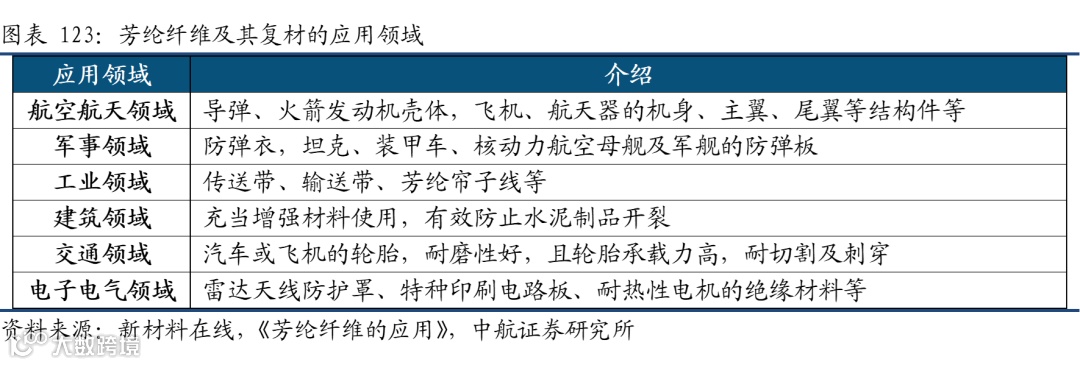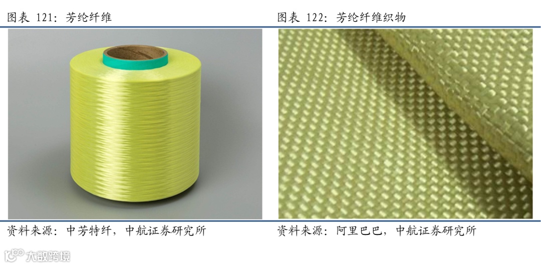 芳纶纤维(Aramid fiber)全称为“芳香族聚酰胺纤维”,具有超高强度、高模量和耐高温、耐酸耐碱、重量轻等优良性能,芳纶纤维于1960s由美国杜邦公司(商品名为Kevlar)研发成功并商业化,因此在碳纤维出现之前,芳纶纤维一直占据着高性能纤维市场。与碳纤维一样,芳纶纤维并不会直接作为最终产品,至少要做成织物或相应的复合材料才能使用。