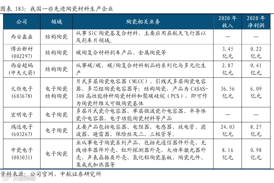 国内先进陶瓷领域的企业数量虽多,但规模普遍较小,核心技术基本依赖引进,从电子陶瓷的应用来看,虽然多种电子陶瓷产品的产量居世界首位,但国内生产的材料仅少部分用于高端元器件产品,大部分用于中低端元器件产品,企业竞争激烈。民品方面,我国的电子陶瓷及其元器件产品生产基地已经形成了相当的规模,并拥有国际先进的生产水平,典型企业包括风华高科、三环集团等陶瓷电子元器件行业中的龙头骨干企业。军品方面,以MLCC产业为例,目前已经形成了宏明电子、鸿远电子、火炬电子等几家比较稳定的竞争格局,各自绑定下游型号客户。除此之外,一些电子陶瓷公司还包括中瓷电子、振华云科(振华科技子公司)等。结构陶瓷方面,主要还是集中在陶瓷基复材,比如刹车耐磨的碳陶材料应用,以及航天火箭耐烧蚀材料的应用等,企业如西安鑫垚、博云新材、超码科技等公司。