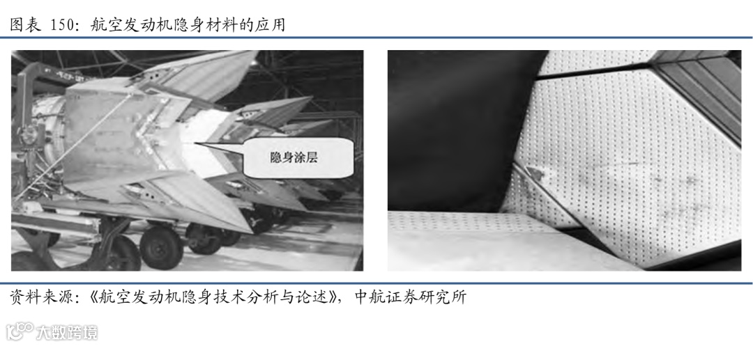 隐身飞机除了对机体有隐身要求外,对发动机更是提出了较高的隐身指标要求。而发动机后腔体及其内部件和边缘等产生的雷达散射信号、后腔体及其热端部件和尾喷流等产生的红外辐射信号占整个飞机尾部方向特征信号的95%以上。如果发动机不能实现后向的隐身,则隐身飞机无法实现全方位的隐身,其作战能力将大幅降低,因此,除了设计方面的隐身技术外,发动机隐身材料的应用也十分重要。F119(F22战斗机发动机)和F135(F35战斗机发动机)发动机采用了大量的隐身涂层,如红外隐身涂层、雷达吸波涂层等。隐身材料的应用可以在不改变结构设计的前提下降低红外辐射和RCS,但发动机高温、高气流冲刷和振动等环境使隐身涂层材料研制和应用产生困难。