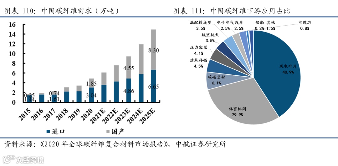 国内碳纤维需求国产替代空间巨大。国内市场方面,2020年国内碳纤维市场总需求为4.89万吨,同比增长了29%,增速远超全球。约占全球46%的市场。但可以发现进口量为3.04万吨(占总需求62%),国产纤维供应为1.85吨(占总需求38%),总体仍然呈现出国内产能存在巨大的供不应求。但随着近几年的发展,我国国产碳纤维比重在不断提升,增长速度也持续加速,给予国内碳纤维需求增速25%,国产碳纤维增速35%,预计到2025年我国碳纤维需求将达到14.9万吨,国产碳纤维占比有望超过55%。