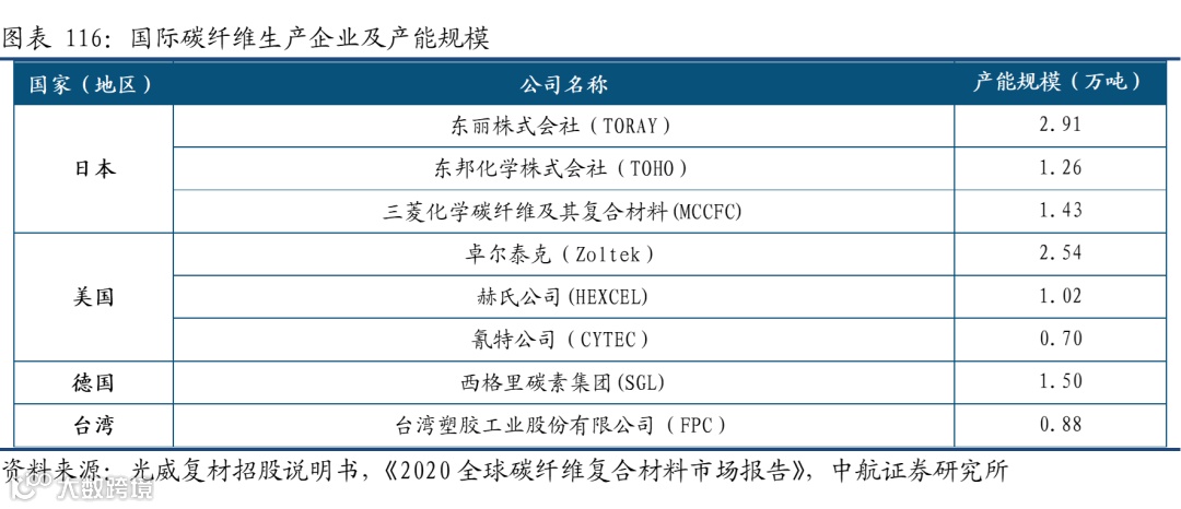 全球属于巨头垄断市场,主要集中在美日欧:整体来看,全球碳纤维市场属于国际巨头垄断市场,小丝束(主要是航空航天用)产品主要集中在日本企业(东丽、东邦、三菱),大丝束产能则主要在欧美(美国卓尔泰克、德国SGL等)。2015年东丽收购卓尔泰克公司后,其产能和市场占比近全球的三分之一,形成一家独大的垄断局面。