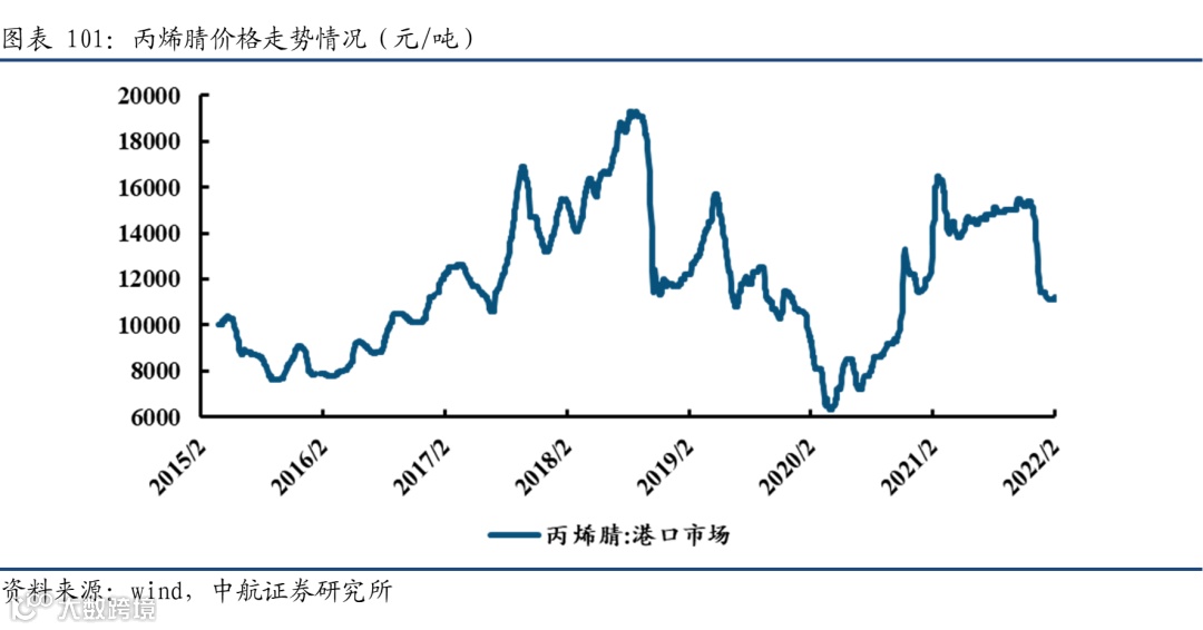 碳纤维原材料为石油化工行业的副产品丙烯腈(AN),主要通过原油炼制、裂解、氨氧化等工序获得。下游应用主要及总在ABS/SAN树脂,腈纶,丙烯酰胺等化工产品,消费占比接近90%,碳纤维应用总体占比仍然较小,但根据Technavio的最新市场研究报告显示,在2019年至2023年期间,碳纤维需求的不断增长预计将推动全球丙烯腈市场实现3%以上的复合年增长。