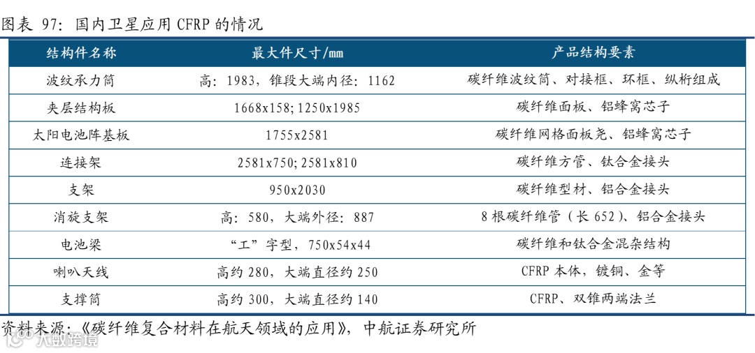 2020年航天领域的碳纤维需求量占航空航天领域碳纤维需求的比例为1.80%,需求基数不大但高性能需求强,应用广泛,同时随着我国远程战略武器的快速发展,有望扩大碳纤维复材的应用占比。根据碳纤维强度和模量特点可应用于不同领域,目前碳纤维复合材料已经广泛应用于导弹武器、运载火箭、卫星和航天飞机等航天领域。一般来说,标准模量通用型T300级碳纤维主要应用导弹主次承力结构件和防隔热部件。高强中模T800级和高模碳纤维主要用于飞行器和导弹等主承力结构件,而高强高模碳纤维主要应用于卫星承力结构件。