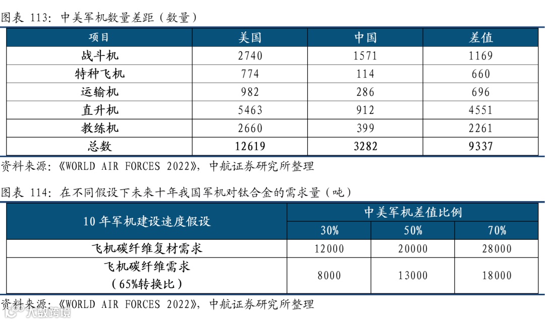 军机碳纤维年需求超千吨。根据《WORLD AIR FORCES 2022》报告,中美之间军用飞机的数量仍有较大差距,假设中国未来10年各类军机建设数量可以达到中美差值的50%,那么预计军机碳纤维复合材料需求可以达到2万吨,再假设碳纤维复材和碳纤维的转换比在65%,那么预计未来10年军机碳纤维需求量为1.3万吨,年均需求超过千吨。