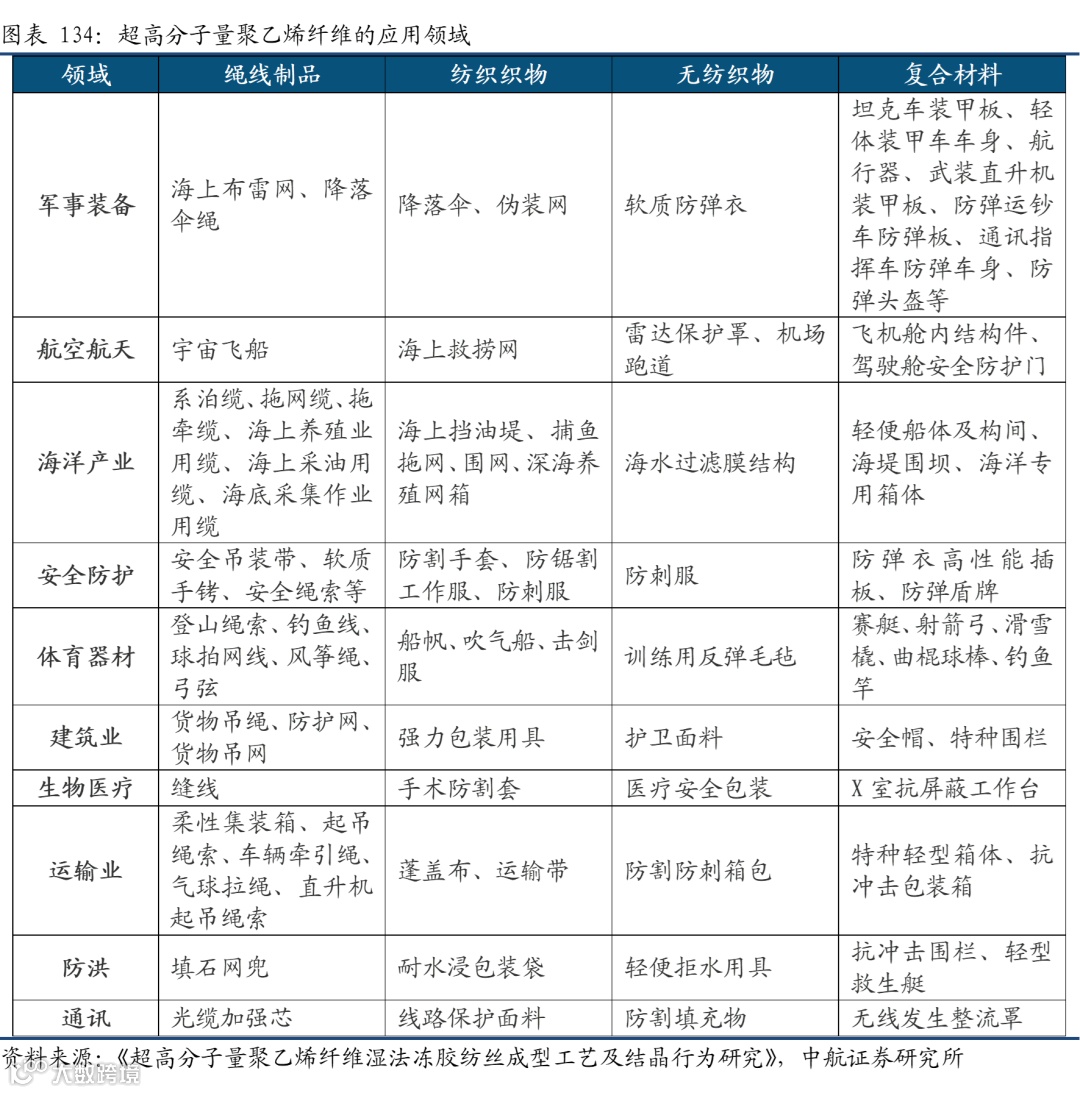 抗冲击性和抗切割性。UHMWPE烯纤维断裂伸长低、断裂功大,具有很强的吸收能量的能力,在抗冲击性能方面,UHMWPE纤维复合材料的比冲击总吸收能量是碳纤维的1.8倍、芳纶的2.6倍,防弹能力是芳纶装甲结构的3.6倍。由于质轻高强及比能量吸收高的特点,UHMWPE纤维已逐步取代芳纶,成为个体防弹防护领域的首选纤维。