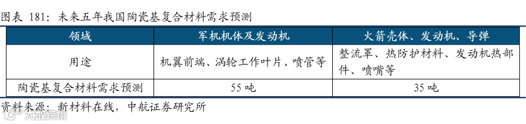 航空航天是陶瓷基复合材料最大的细分应用市场,占总体的43%左右。随着我国高推重比航空发动机的定型、空间飞行器技术的迫切需求和快速发展,陶瓷基复合材已经在军用、民用领域展现出巨大的发展潜力。