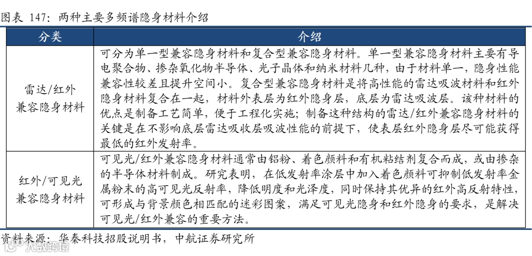 隐身材料是具有隐身功能材料的一种统称,产品形态主要可分为涂层材料和结构材料两种,下游具体应主要是国防军工领域。随着武器装备侦查手段以及现代电子战的快速发展,新型武器装备对应的雷达、红外隐身材料应用无论是从深度还是广度都有所提升。