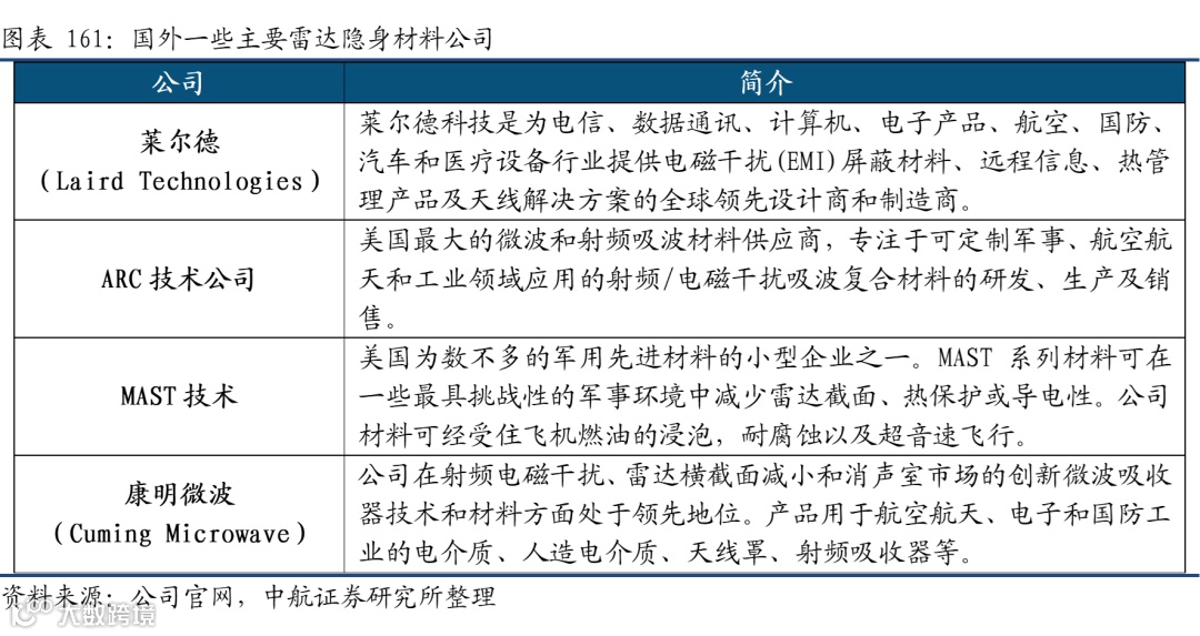 国外相关的隐身材料起步早,由于隐身材料技术涉及重大军事材料的研制,国外在该项技术方面对我国实行严密的封锁,因此国外的隐身材料企业不会对国内形成直接竞争。但值得注意的是,国外常规化吸波涂料、吸波贴片已经形成系列化、商品化,其中以莱尔德的ECCOSORB@系列产品为典型代表。如ECCOSORB@FGM系列宽频带吸收贴片材料以及CR系列吸波涂层等。同时以美国为代表,已经形成了如莱尔德、康明微博、ARC技术等具有一定技术的隐身材料公司。