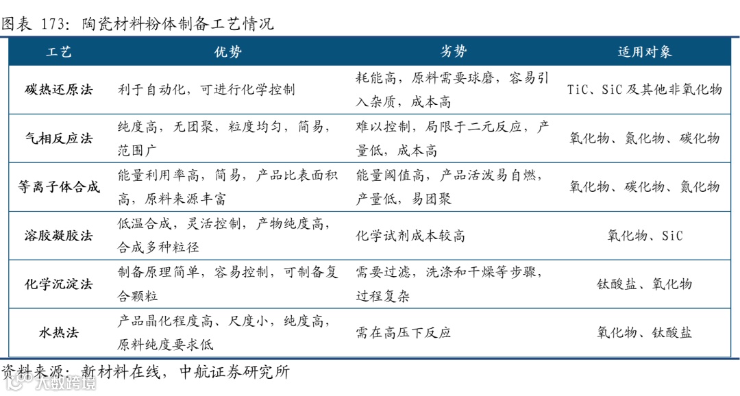 先进陶瓷的粉体制备:先进陶瓷所使用的粉末在纯度和颗粒分布上都远高于普通陶瓷,传统的机械研磨方法难以适用。根据不同的陶瓷使用不同的研磨设备,目前粉体的制备工艺以化学法为主,辅以少数物理方法。而粉体制备是陶瓷制备过程中最核心的技术。高纯、超细、高性能陶瓷粉体制造技术基本掌握在日本、美国等少数发达国家,是制约我国先进电子陶瓷产业发展的主要瓶颈。