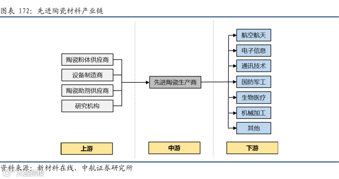 先进陶瓷产业链上游主要为各种陶瓷粉体原料供应商,如氧化铝、氧化锆、碳化硅、氮化铝、钛酸钡、氮化硼等,以及设备制造商、各种陶瓷助剂供应商等;中游为各种先进陶瓷零部件的加工与制造,下游为先进陶瓷产品的各种应用,包括航空航天、电子信息、通讯、生物医疗等。产业链中粉体制备是最核心的技术之一。高纯、超细、高性能陶瓷粉体制造技术是制约我国先进电子陶瓷产业发展的主要瓶颈。