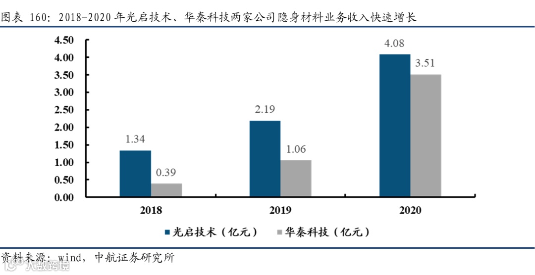 随着我国新装备定性批产,市场应用规模快速提升。从全球隐身材料的市场规模来看,据统计,2017年全球隐身超材料在武器装备中的应用市场规模大约在1.3亿美元。到2025年,这一规模有望达到11.7亿美元左右,年均复合增长率在30%以上。根据Global Market Insights Inc.的研究报告,到2026年,隐形涂料市场规模预计将超过8.34亿美元,其中航空航天和国防产品(例如军用飞机,导弹,武器和潜艇)的消费将强劲推动对隐形涂料的需求。对于我国来讲,随着新型武器装备的批产,将带动隐身材料需求应用的快速增长。从光启技术以及华秦科技两家公司披露的数据来看,两家公司隐身材料相关业务都得到了快速增长,光启技术2019-2020年的增速分别为63%、86%。而华秦科技这两年的增速达到了169%和231%。