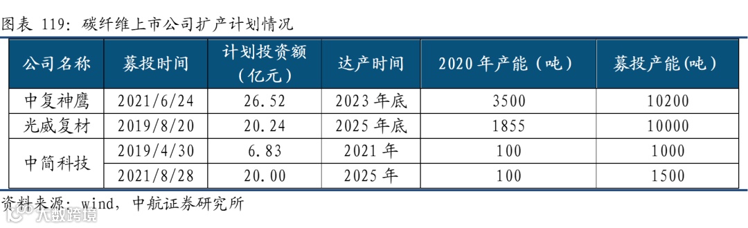 高端碳纤维供不应求,纷纷扩产满足航空航天高速增量需求。在目前国内军用碳纤维整体供不应求的情况下,这些厂商之间竞争情况相对平和,对于目前一些批产型号基本是各自独供,但未来随着各企业的产能上台阶,一些新型号装备的预研或形成竞争。航空航天的高景气带动相关企业纷纷提出扩产计划,如中简科技在2021年千吨线投入生产后,马上提出1500吨产能的扩产计划。