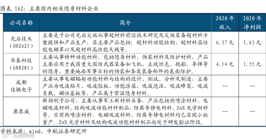 相较于国外,国内方面商业化进程仍处于发展初期,目前开展研究的包括各大军工集团下属研究院以及各大高校等,由于隐身材料本身技术路线多样、保密严格等原因,目前公开的隐身材料公司并不多,虽然都是应用在武器装备上的隐身材料,但由于应用的工艺类型、应用的装备型号的不同等,并没有强烈的直接竞争。具体的公司主要有华秦科技、光启技术以及佳驰电子等。