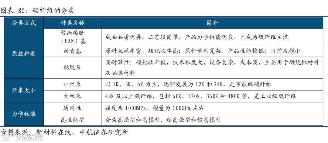碳纤维可以按照原丝类型、力学性能、丝束大小等不同维度进行分类: