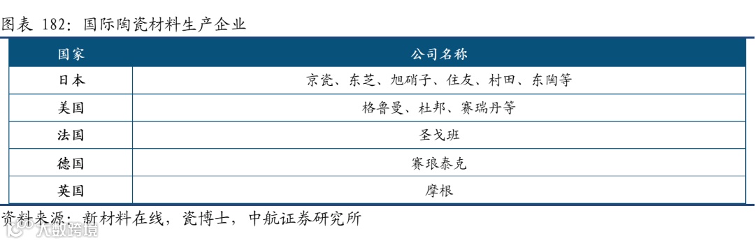 随着现代高新技术的发展,先进陶瓷已逐步成为新材料的重要组成部分,但与欧美、日本等发达国家相比,我国的先进陶瓷产业除少数达到甚至超过国外同行外,总体上是明显落后于发达国家的水平。目前国外先进陶瓷发展处于领先地位的主要有美国、日本、欧盟、俄罗斯等。日本作为全球最大的先进陶瓷生产基地,其市场份额占50%以上,功能陶瓷领域基本垄断国际市场,知名企业包括京瓷、东芝、旭硝子、住友、村田、东陶等。美国是全球第二大先进陶瓷材料生产基地,占全球市场份额20%以上,知名企业有格鲁曼、杜邦、赛瑞丹等。欧洲市场份额仅次于日本和美国,德国、法国在结构陶瓷上是重点研发领域,知名企业有法国圣戈班公司、德国赛琅泰克公司、英国摩根公司等。