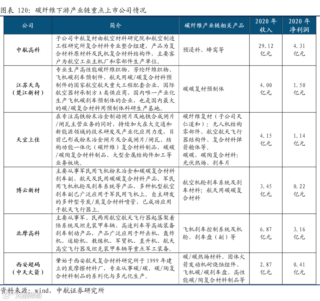 碳纤维复材重要中间环节预浸料与预制体。树脂基碳纤维在生产过程中,预浸料的生产是关键的中间体,一般碳纤维生产企业在打通下游复材生产能力时,基本都具备预浸料生产能力,比如光威复材、恒神股份等都可以进行预浸料的生产,但在我国航空用预浸料方面,基本被中航高科下的中航复材所垄断。预制体是碳/碳复材重要的制造环节,主要的上市企业是楚江新材子公司江苏天鸟,同时天宜上佳2021年碳纤维预制体生产线实现投产。碳碳复材方面,国内主要上市企业有博云新材、北摩高科、天宜上佳以及中天火箭子公司等。