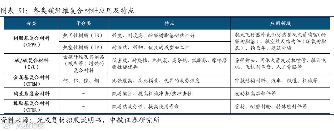 碳纤维及碳纤维复合材料属于战略性先进原材料,是国防装备的关键材料,在航空航天、轨道交通、风力发电、新能源汽车、建筑补强等领域具有广阔的应用空间。碳纤维材料的优异性能主要包括:①质量轻,强度高:密度为1.5-2g/cm³,相当于钢的1/4、铝合金的1/2;强度比钢大4-5倍、比铝大6-7倍,弹性回复为100%;②耐高温、低温:在3000℃非氧化气氛下不融化、不软化,在液氨温度下依然很柔软、不脆化,热弹性系数小;③导电性能好:25℃时高模量碳纤维的比电阻为775Ω*cm,高强度碳纤维为1500Ω*cm;④耐酸性好:对酸呈惰性,耐浓盐酸、磷酸、硫酸等侵蚀;还具有耐油、抗辐射特性。⑤摩擦系数小:自身具有润滑性。
