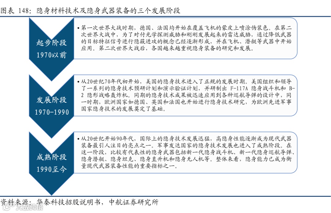 世界军事强国的武器装备隐身化呈现出从部分隐身到全隐身、从单一功能隐身到多功能隐身、从少数武器装备隐身到实现多数主战兵器装备隐身的循序渐进的发展趋势,且隐身技术正向“多频谱、全方位、全天候、智能化”的方向发展。目前隐身材料技术已经广泛应用在国防军工的各个装备领域。