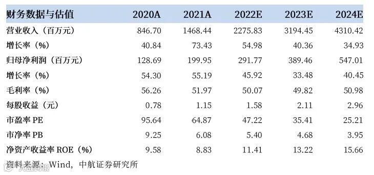基于以上观点,我们预计公司2022-2024年的营业收入分别为22.76亿元、31.94亿元和43.10亿元,归母净利润分别为2.92亿元、3.89亿元及5.47亿元,EPS分别为1.58元、2.11元、2.96元,我们给予“买入”评级,目标价格88.70元,分别对应56.14倍、42.10倍及29.98倍PE。