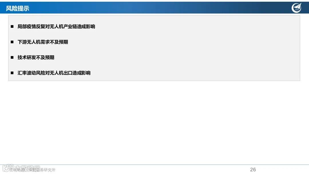风险提示:局部疫情对无人机产业链造成影响、下游无人机需求不及预期、技术研发不及预期、汇率波动风险对无人机出口造成影响