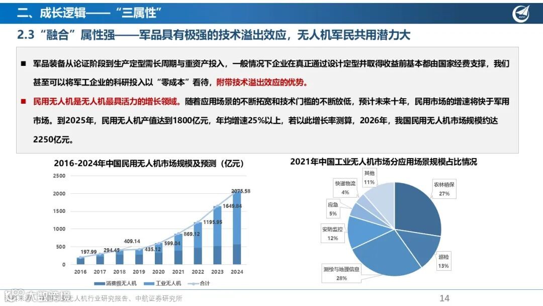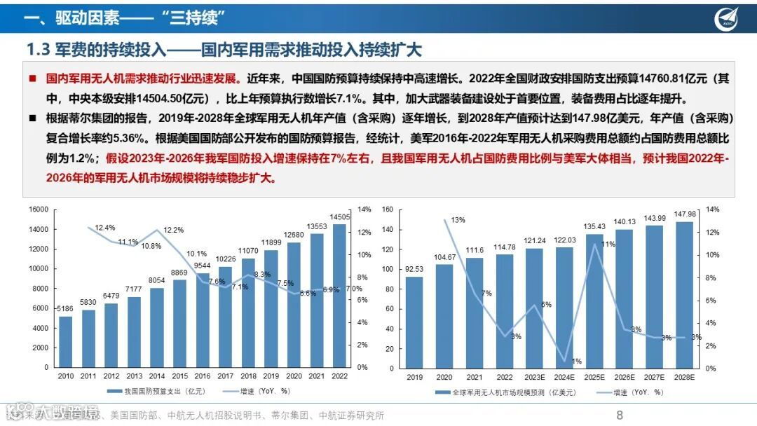 随着战争形态加速演变,建设智能化军事体系已成为世界军事发展重大趋势。各类无人机系统大量出现,无人作战正在深刻改变战争面貌。由于无人机与有人机相比具有使用经济性好、设计性较强等特点,叠加远程控制技术、自主导航技术、电子信息技术、航空航天技术的加速推进,军用无人机打破了先前主要用于情报、监视、侦察等任务的传统模式,开始从单纯的传感器平台向主力作战平台转变;同时,军用无人机还具有消耗属性、成长属性和军民融合属性等典型特点,目前军用无人机在国内还属于成长期,“十四五”期间行业将保持高速增长。