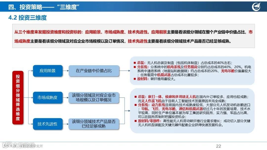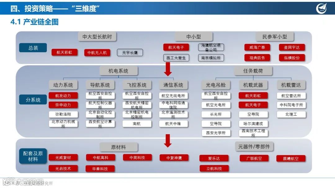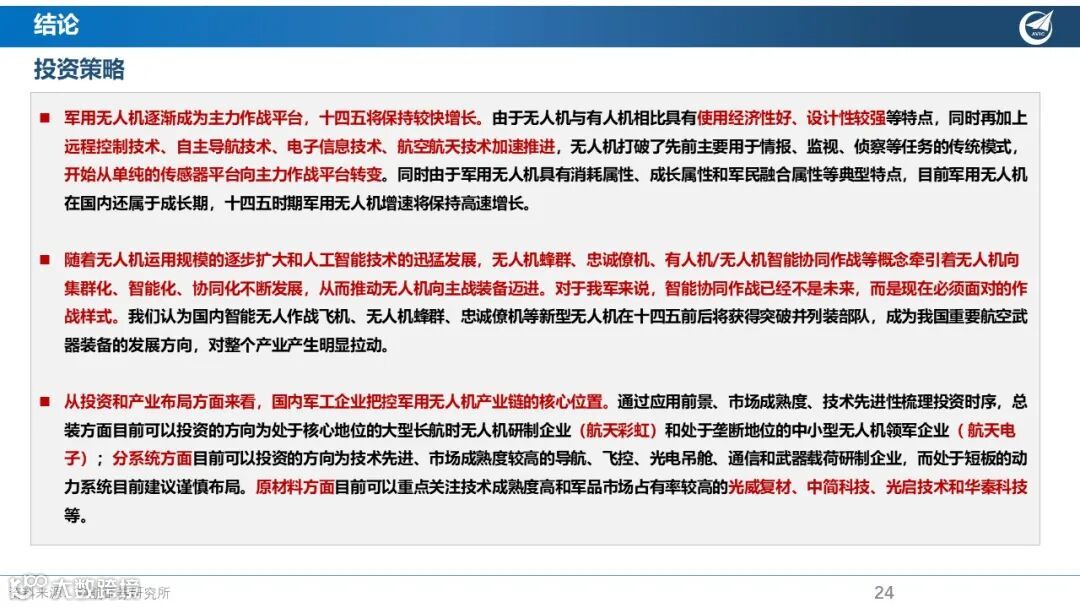 从投资和产业布局方面来看,国内军工企业把控军用无人机产业链的核心位置。通过应用前景、市场成熟度、技术先进性梳理投资时序,总装方面目前可以投资的方向为处于核心地位的大型长航时无人机研制企业(航天彩虹)和处于垄断地位的中小型无人机领军企业(航天电子);分系统方面目前可以投资的方向为技术先进、市场成熟度较高的导航、飞控、光电吊舱、通信和武器载荷研制企业,而处于短板的动力系统目前建议谨慎布局。原材料方面目前可以重点关注技术成熟度高和军品市场占有率较高的光威复材、中简科技、光启技术和华秦科技等。