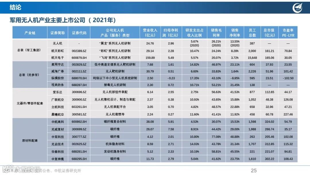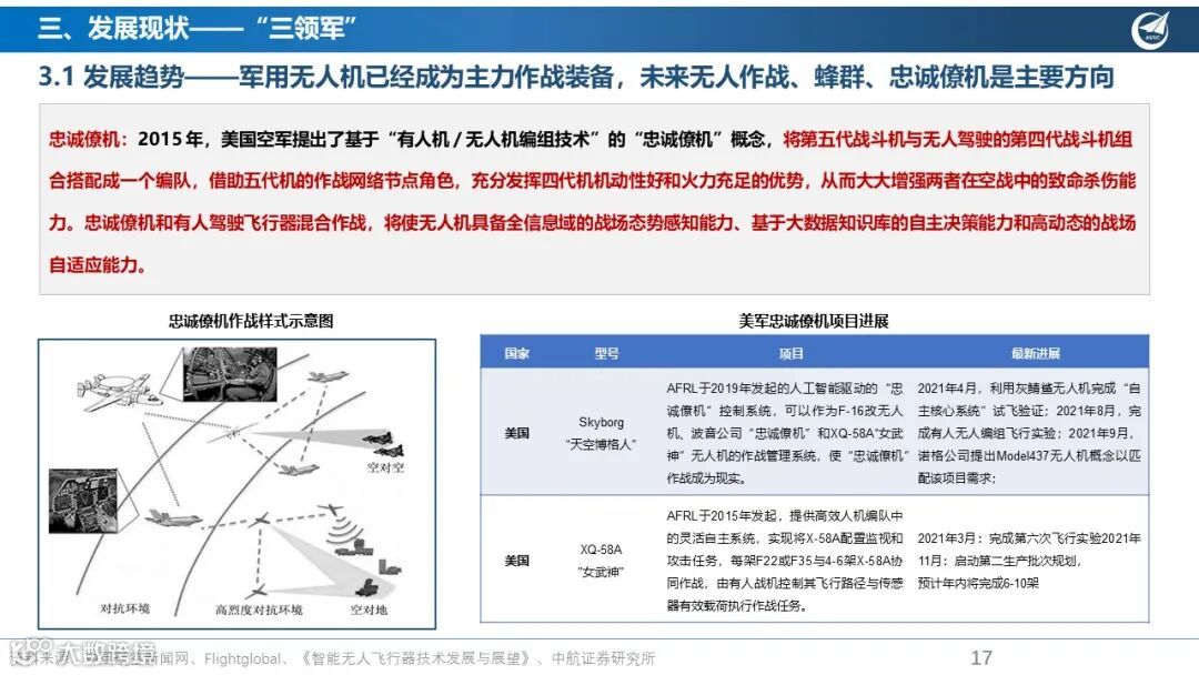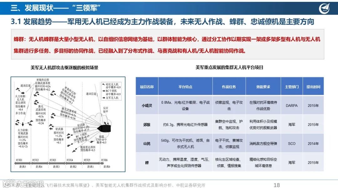 随着无人机运用规模的逐步扩大和人工智能技术的迅猛发展,无人机蜂群、忠诚僚机、有人机/无人机智能协同作战等概念牵引着无人机向集群化、智能化、协同化不断发展,从而推动无人机向主战装备迈进。对于我军来说,智能协同作战已经不是未来,而是现在必须面对的作战样式。我们认为国内智能无人作战飞机、无人机蜂群、忠诚僚机等新型无人机将获得突破并列装部队,成为我国重要航空武器装备的发展方向,对整个产业产生明显拉动。