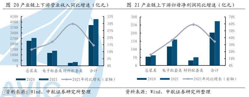 中上游企业存货增速提升,下游企业存货增速下降。中上游企业2021年存货增速均大幅提升,其中材料配套类企业2020年、2021年存货增速分别为15.98%、17.53%,电子配套类企业2020年、2021年存货增速分别为18.32%、26.04%,充分体现了上中游企业为满足总体的交货进度正在积极备货。