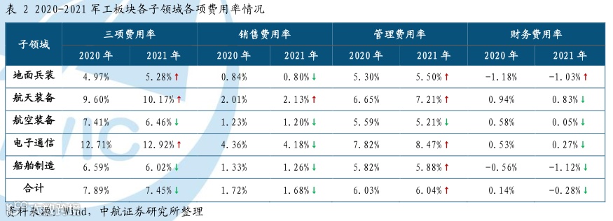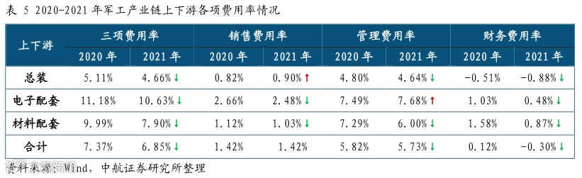 财务费用下降明显导致三项费用增速较低。军工行业2021年三项费用同比增长6.82%远低于营业收入增速;具体来看,2021年度销售费用、管理费用、财务费用同比增速分别为10.72%、13.31%、-326.92%,财务费用同比显著下降导致三项费用增速平稳。