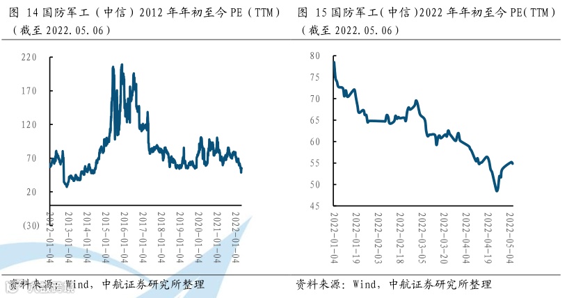 板块持续回调下估值回归,配置机会凸显。目前军工板块估值已调整至2013年水平,处于军工板块近10年来较低位置。经过2022年一季度股价的深度调整,军工板块市盈率估值回归至54.84倍。总体来看,国防军工建设是我国的强军战略,军工行业的中长期成长逻辑不变,深度下跌使当前行业的估值消化明显,虽然军工行业估值仍高于其他行业,但行业市盈率倍数已从最高点的209倍下降到54.84倍,处于历史相对低位。