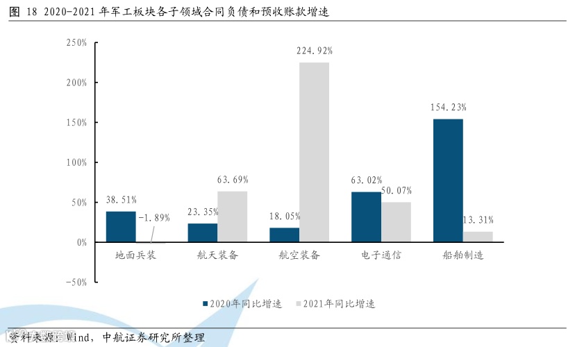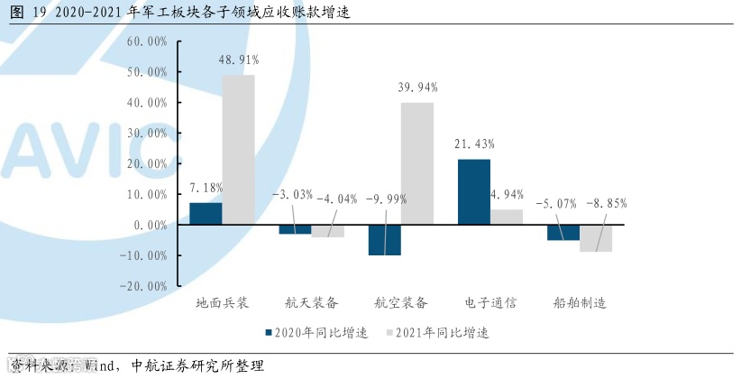 合同负债和预收账款整体增速高,航空板块增速尤高。从合同负债和预收账款的角度来看,2021年行业整体增速为55.57%,其中航空装备板块的合同负债和预收账款为834.63亿元,同比增长224.92%,在各板块中遥遥领先,主要是受益于飞机和发动机总体单位在这两个科目的大幅增加,表明我国军机的相关重点产品订单需求旺盛;航天装备和电子通信的合同负债和预收账款增速分别为63.69%和50.07%,说明产业链各公司充分受益于武器装备的更新换代和国产替代进程,在手订单饱满,将为未来的业绩释放提供坚实基础。