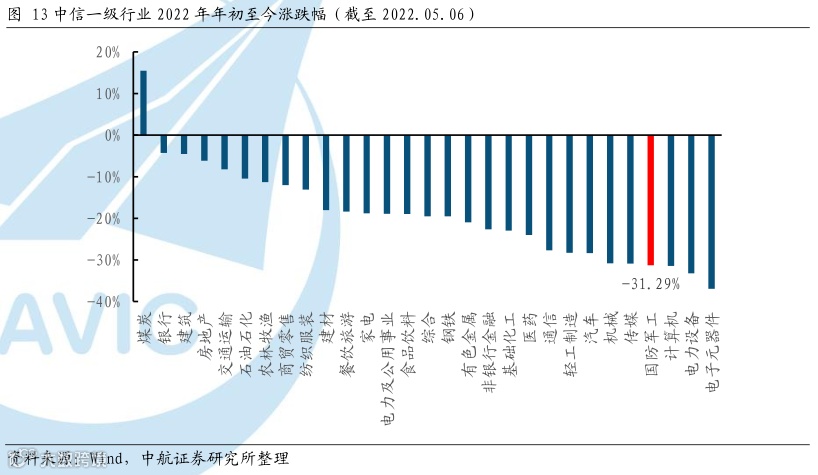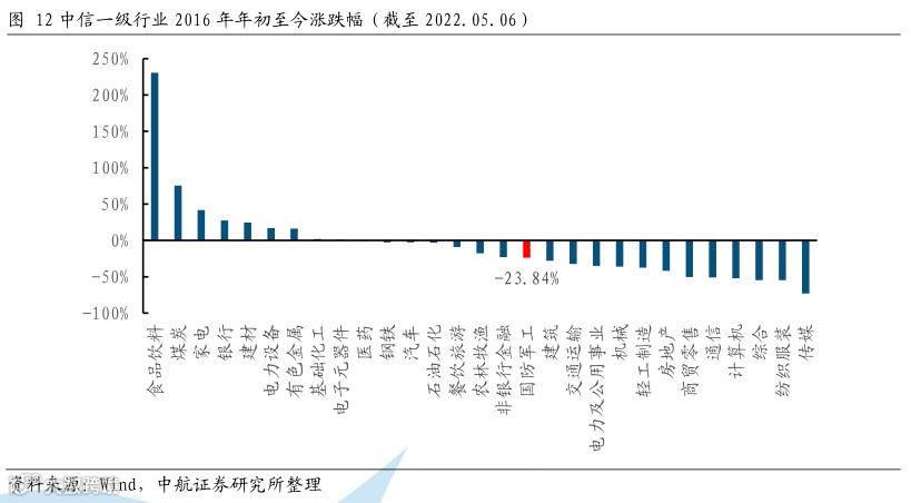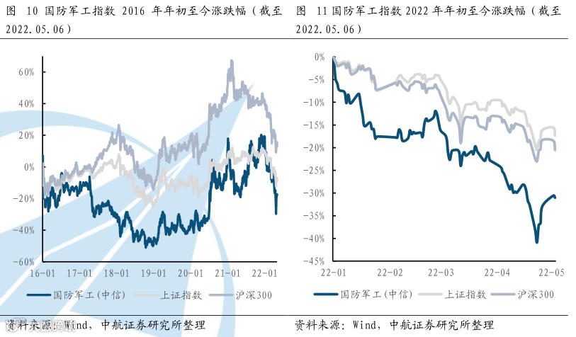 军工板块表现弱于大盘。整体上看,由于军工资产证券化等政策的推动,军工板块在历史上积累了较大涨幅,但自2016年年初至今,国防军工指数下跌23.84%,在中信29个行业里排名倒数第17。2022年年初至今,由于外部美元加息及疫情等宏观因素影响大盘回调下,市场风险偏好降低,国防军工指数随大盘下跌31.04%,在中信29个行业里排名第26位。
