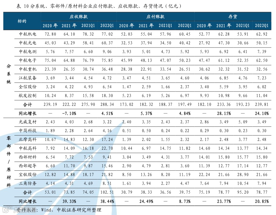 航空产业链景气程度高,订单和产品交付推动业绩增长。预收款和合同负债主要源于军方用户或下游企业向中上游发布订单,能够体现在手订单情况,据统计2021年、2022Q1总装企业预收款和合同负债同比增长分别为230.02%、252.20%,反映了“十四五”开局阶段订单情况持续向好,军品订单持续高景气。应收账款主要反映销售扩张情况、回款速度、交货速度等,需要与其他指标比如营业收入增速和存货增速结合起来一起分析,2020年、2021Q1分系统企业应收账款增速与零部件/原材料企业应收账款增速相比差距明显,同时2020年、2021Q1分系统企业、零部件/原材料企业同期营收增速均表现良好,或可验证分系统企业产品交付加速、行业景气度逐渐向中上游传导。应付账款反映为满足订单生产的采购备货情况,存货主要反映企业对订单的投产情况,主要包括原材料、在制品和库存等,2021年、2022Q1总装企业应付账款增速远高于中上游企业同期应付账款增速,而2021年、2022Q1总装企业存货增速远低于中上游企业同期存货增速,反映了中下游企业为满足总装企业的订单生产而大量采购备货,验证了航空产业链景气程度较高,行业景气度逐渐向中上游传导。