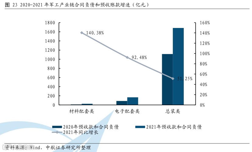 上游、中游、下游企业合同负债和预收款增速依次提升,再次验证了军工产业链景气度从上游向下游有序传导。具体来看,总装类、电子配套类、材料配套类企业2021年合同负债和预收款增速分别为51.25%、92.48%、140.38%。从合同负债和预收账款的角度来看,军工产业链整体景气度高,同时上游景气度最高、中游次之、下游更次之,景气度高从产业链上游向中下游传导。