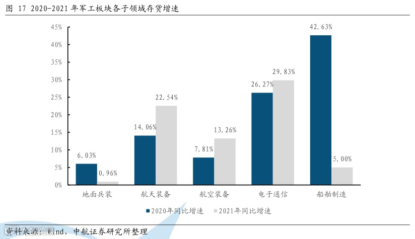 航空航天电子存货增速较高,表明相关板块积极备货。2021年军工行业存货平均增速为12.32%,其中电子通信板块存货增速为29.83%、航天装备板块存货增速为22.54%、航空装备板块存货增速为13.26%,均高于行业平均值。航天板块多为制造和零部件企业,结合电子通信板块的存货增长来看,充分体现了上游元器件和零部件企业为满足总体的交货进度正在积极备货。船舶板块存货增速降低,或因为去年需求激增带来的原有存货快速消化。
