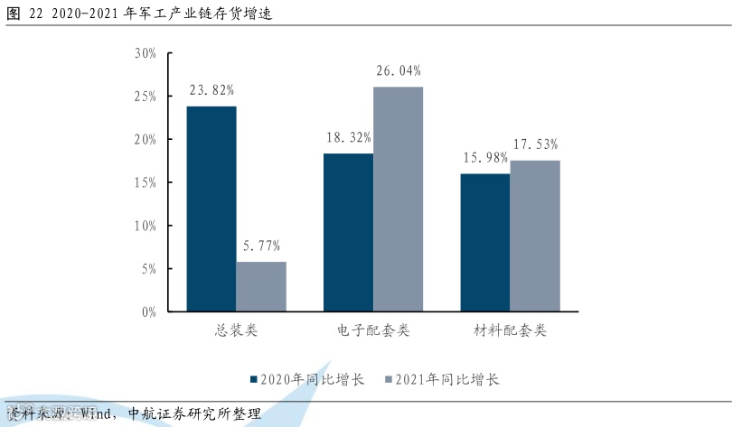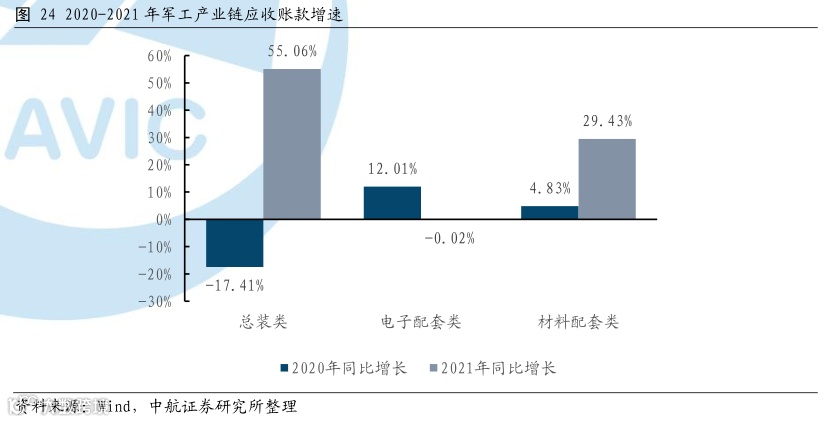 产业链两端应收账款增速最高,反映军品需求旺盛,产品交付加速。总装类企业和材料配套类企业2021年应收账款与2020年相比增速均大幅提升,而电子配套类企业2021年应收账款与2020年相比增速下降。同时总装类企业和材料配套类企业2021年应收账款与2020年相比增速均高于对应期间的营业收入增速,反映军品需求旺盛,产品交付加速。