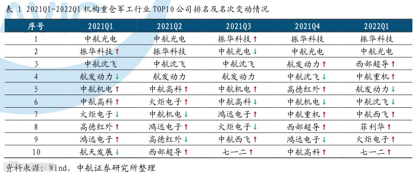 板块内基金重仓主要集中于核心军工资产。2022Q1基金重仓国防军工行业前十的公司变化不大,主要集中于主机厂中航沈飞、中航西飞等,元器件龙头企业振华科技、中航光电,高端材料企业西部超导等核心军工资产。但从资金对前十大重仓个股的配置角度看,2022Q1机构对西部超导、中航重机、中航西飞、菲利华、火炬电子、七一二持仓增多,减少了对航发动力、中航沈飞的持股。