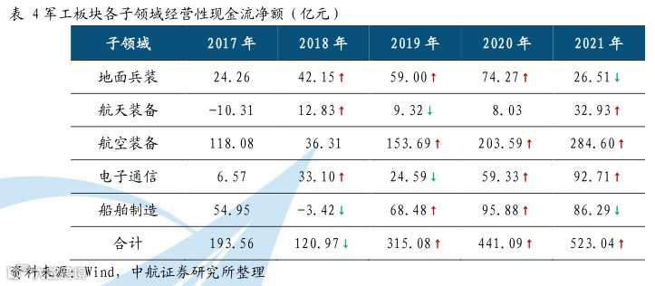 “十四五”开局之年,军工行业现金流整体持续向好。2021年军工行业经营性现金流持续增长,达到523.04亿元。具体来看,航天装备、航空装备及电子通信2021年经营性现金流净额与去年同期相比有所改善,航天装备改善尤为明显;而地面兵装和船舶制造2021年度经营性现金流净额与去年同期相比有所减少。